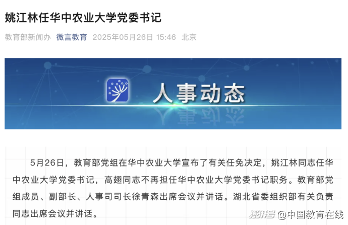 5月26日,教育部黨組在華中農(nóng)業(yè)大學(xué)宣布了有關(guān)任免決定,姚江林同志任華中農(nóng)業(yè)大學(xué)黨委書(shū)記,高翅同志不再擔(dān)任華中農(nóng)業(yè)大學(xué)黨委書(shū)記職務(wù)。教育部黨組成員、副部長(zhǎng)、人事司司長(zhǎng)徐青森出席會(huì)議并講話(huà)。湖北省委組織部有關(guān)負(fù)責(zé)同志出席會(huì)議并講話(huà)。