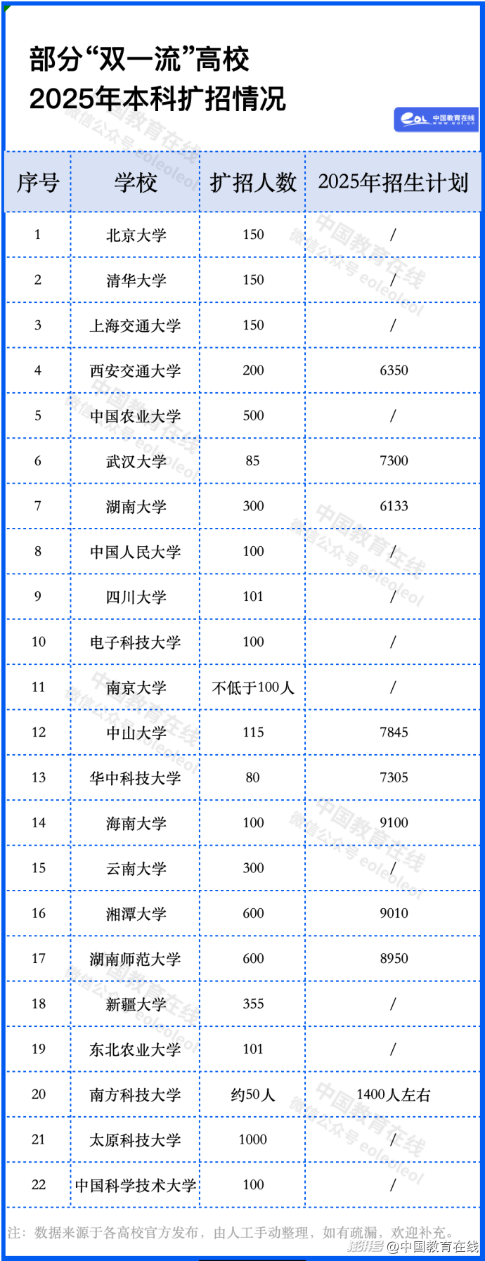 2025年,太原理工大學(xué)繼續(xù)擴大招生規(guī)模,較去年預(yù)計增加1000人。3月10日,湖南師范大學(xué)表示今年擬新增600個招生名額,招生總規(guī)模將達到8950人。此外,中國農(nóng)業(yè)大學(xué)今年將擴招本科生500人。新疆大學(xué)、云南大學(xué)、湖南大學(xué)擴招名額均在300人及以上。