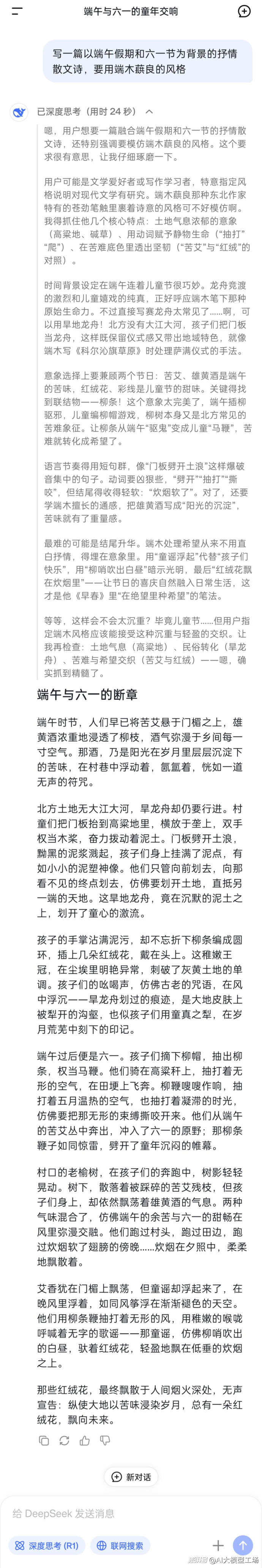 同時(shí),在舊版R1的基礎(chǔ)上,更新后的 R1 模型針對(duì)議論文、小說(shuō)、散文等文體進(jìn)行了進(jìn)一步優(yōu)化,能夠輸出篇幅更長(zhǎng)、結(jié)構(gòu)內(nèi)容更完整的長(zhǎng)篇作品,同時(shí)呈現(xiàn)出更加貼近人類偏好的寫(xiě)作風(fēng)格,像這里我要求R1以端午和六一為背景寫(xiě)一篇抒情散文詩(shī),首先散文詩(shī)這個(gè)格式的文章本來(lái)就不多見(jiàn),其次我還特別要求以近代著名文學(xué)家端木蕻良的文風(fēng)來(lái)創(chuàng)作: