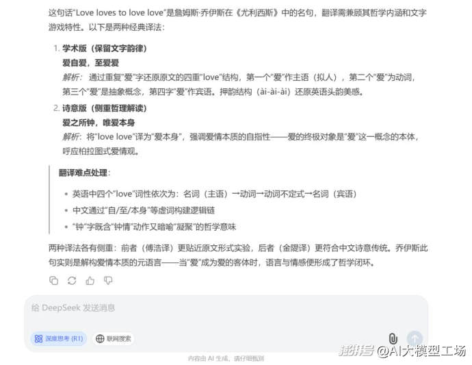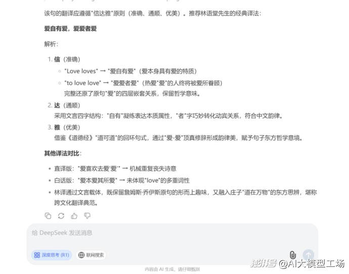 R1能夠自動(dòng)匹配到林語(yǔ)堂先生的語(yǔ)錄,并且能夠幫我們?nèi)?duì)比與直譯的差別,可謂是文科強(qiáng)者,這在先前版本的R1那個(gè)理工腦子是不存在的。
