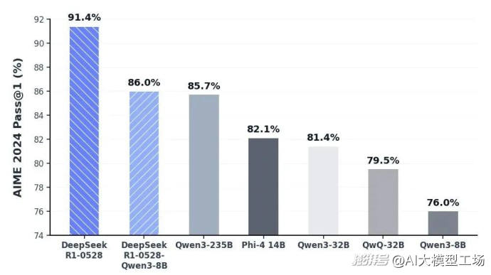 同時(shí),深度求索還基于DeepSeek-R1-0528的思維鏈,后訓(xùn)練了Qwen3-8B Base,得到了 DeepSeek-R1-0528-Qwen3-8B。而該8B模型在數(shù)學(xué)測(cè)試 AIME 2024 中僅次于DeepSeek-R1-0528,超越 Qwen3-8B(+10.0%),與 Qwen3-235B 相當(dāng)。再次證明了全新R1的強(qiáng)勁能力。