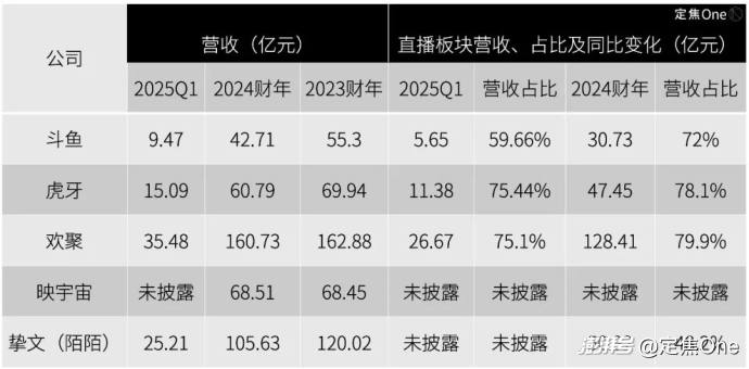 2025年Q1,也延續(xù)了這一趨勢,斗魚、虎牙、歡聚的直播營收占比分別為約60%、75%、75%,而摯文從2025年Q1起將直播服務與增值服務合并為“增值服務”,不再單獨披露。