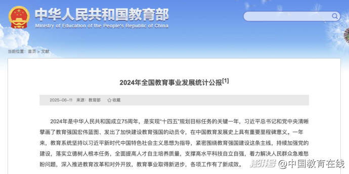 6月11日,教育部網(wǎng)站發(fā)布2024年全國教育事業(yè)發(fā)展統(tǒng)計公報。