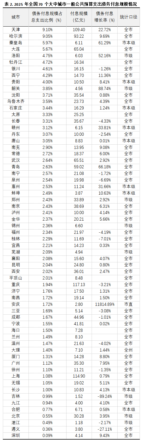 再看一般公共預(yù)算口徑看付息支出(參見(jiàn)表2)。在全國(guó)70個(gè)大中城市中,除去岳陽(yáng)、北海、濟(jì)南、煙臺(tái)數(shù)據(jù)不齊,余下66個(gè)城市中,有3個(gè)城市2025年一般債付息支出預(yù)算超過(guò)百億,分別是重慶(117.13億)、上海(114.90億)、天津(109.40億)。一般債付息規(guī)模普遍小于專(zhuān)項(xiàng)債付息規(guī)模。