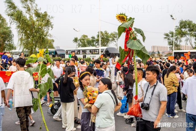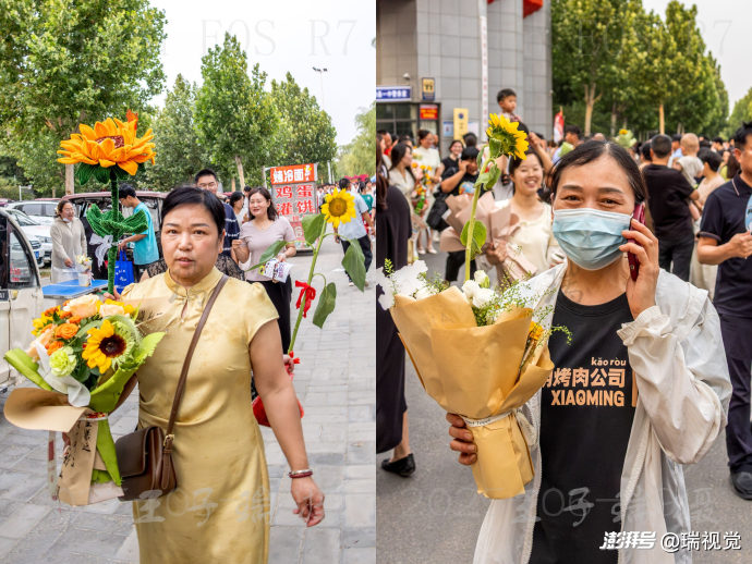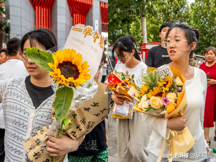 也有父母舉著花束在人群中踮腳張望,花盤在頭頂晃動,宛如一片躍動的星光。
