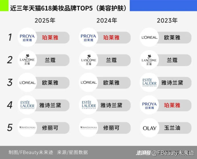 就星圖數(shù)據(jù)發(fā)布的天貓618近三年美妝品牌的排名情況看,美容護(hù)膚的排名情況變化不大,與2024年相同,今年的TOP5品牌分別為珀萊雅、蘭蔻、歐萊雅、雅詩蘭黛、修麗可。珀萊雅穩(wěn)住了第一的席位,歐萊雅集團(tuán)頭部品牌矩陣優(yōu)勢依舊突出,其品牌蘭蔻、歐萊雅、修麗可在前五中占據(jù)了三個席位。