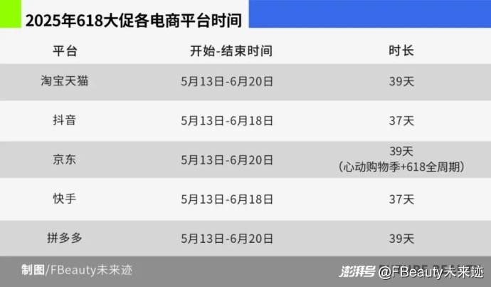 今年618大促周期的確再度拉長,5月13日成為了京東、天貓、抖音等多個電商平臺預(yù)售開啟節(jié)點,各平臺618大促全周期基本都在35-40天的區(qū)間內(nèi),堪稱“史上最長618”。
