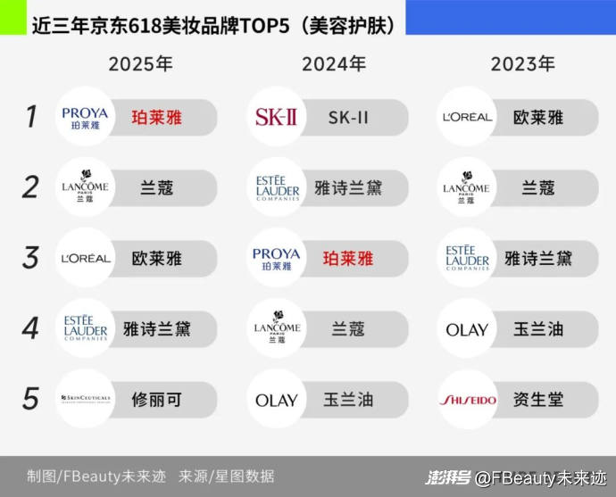 就星圖數(shù)據(jù)發(fā)布的京東618的美妝排名情況來看,該平臺還是以國際品牌為主,今年美容護(hù)膚的前五名分別為珀萊雅、蘭蔻、歐萊雅、雅詩蘭黛、修麗可。不過,珀萊雅為國貨爭了一口氣,在美容護(hù)膚品類中從2024年的第三名,上升至今年的第一名。