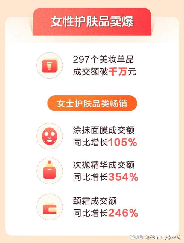 在抖音官方發(fā)布的《2025抖音商城618好物節(jié)數(shù)據(jù)報告》中,女性護(hù)膚品表現(xiàn)也被提及,該報告顯示:297個美妝單品成交額破千萬元。同時,女士護(hù)膚品類暢銷,涂抹面膜成交額同比增長105%;次拋精華成交額同比增長354%;頸霜成交額同比增長246%,強(qiáng)調(diào)美妝細(xì)分品類的增長潛力。