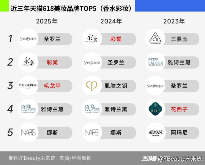 香水彩妝的排名變化較大,歐萊雅集團(tuán)旗下的圣羅蘭表現(xiàn)強(qiáng)勁,從2023年的第三名,一路上漲至第一。盡管彩棠從去年的第一下滑至第二,但是毛戈平?jīng)_上榜單第三,為國貨再奪得一個席位。