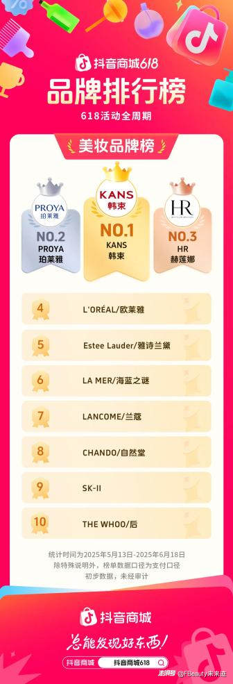抖音官方發(fā)布的“618活動全周期品牌排行榜”顯示,韓束、珀萊雅、赫蓮娜、歐萊雅、雅詩蘭黛位居美妝品牌榜前五名,國貨品牌包攬前二,TOP10中共占據(jù)三位。抖音榜單“去白牌化”趨勢明顯,以赫蓮娜為代表的國際品牌在抖音迎來一輪新增長。