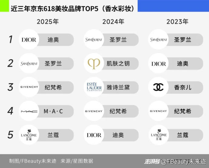 在香水彩妝品類中,今年的前五名為迪奧、圣羅蘭、紀(jì)梵希、M·A·C、蘭蔻,迪奧打破圣羅蘭連續(xù)兩年登頂?shù)挠涗?,成為品牌第一?/p>