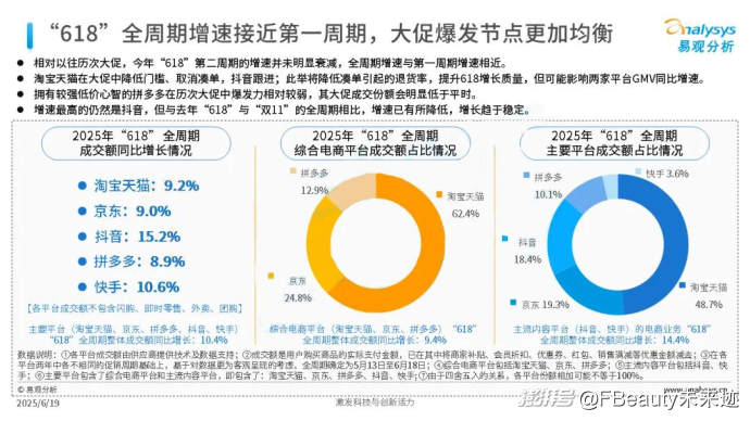 就平臺表現(xiàn)來看,易觀分析指出,2025年618全周期(5月13日-6月18日)主流電商平臺成交額占比為:淘寶天貓48.7%、京東19.3%、抖音18.4%、快手和拼多多共計13.7%。綜合來看,天貓?zhí)詫?、京東、抖音位列今年618線上交易平臺前三名。