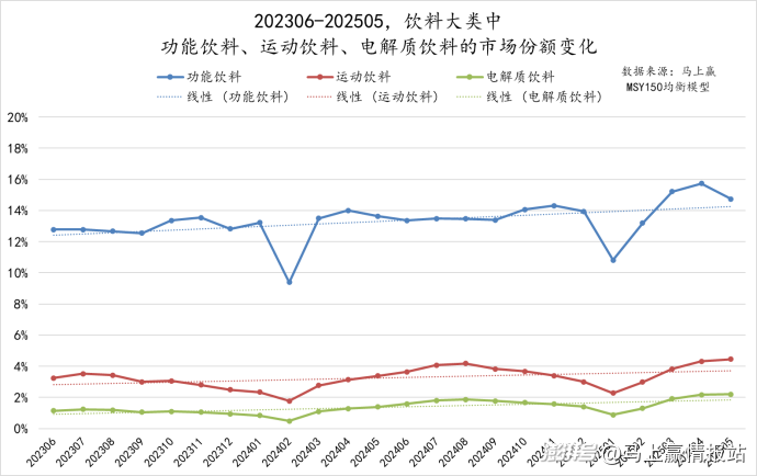 從份額上看,電解質(zhì)飲料屬于運(yùn)動(dòng)飲料類目中的一個(gè)類型產(chǎn)品,運(yùn)動(dòng)飲料則屬于功能飲料中的一個(gè)細(xì)分類目。從三者的份額變化中可以顯著的看到,三者在202306-202505近兩年的市場份額變化中均呈現(xiàn)上漲趨勢,其中的電解質(zhì)飲料雖然在飲料大盤中整體占比還較小,但也呈現(xiàn)著較好的份額上漲趨勢,截止2025年4、5月,類型產(chǎn)品在飲料大盤中的市場份額均已突破2%。