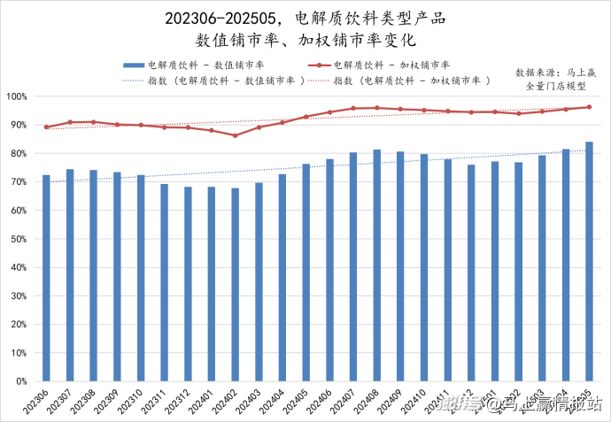 可以看到,隨著外星人電解質(zhì)水等一系列電解質(zhì)飲料產(chǎn)品的持續(xù)推廣,電解質(zhì)飲料類型產(chǎn)品的數(shù)值鋪市率、加權(quán)鋪市率都在202306-202505的時(shí)間段中走出了明顯的上行趨勢。目前,電解質(zhì)飲料類型產(chǎn)品的加權(quán)鋪市率已經(jīng)接近95%,數(shù)值鋪市率超過70%,對于高效的銷售渠道已經(jīng)基本完成了全面的覆蓋。
