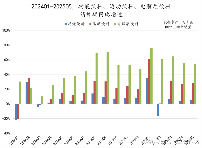 雖然市場份額整體占比還不高,但電解質(zhì)飲料的銷售額同比增速卻顯著高于功能飲料、運(yùn)動(dòng)飲料兩個(gè)上級類目。