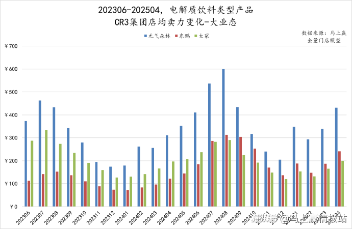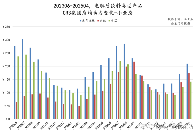在更加傾向于家內(nèi)囤貨消費(fèi)場景的大業(yè)態(tài)店均賣力中,可以看到,元?dú)馍值念I(lǐng)先優(yōu)勢整體更加明顯,與東鵬、大冢的店均賣力差距更大,這或許也與元?dú)馍滞庑侨穗娊赓|(zhì)水豐富的規(guī)格、多樣化的口味與組合相關(guān),這些組合更加適合在大業(yè)態(tài)中進(jìn)行銷售。相比來說,東鵬同樣是在2024年下半年逐漸超越大冢集團(tuán),但兩者之間店均賣力的差距更小,后續(xù)競爭是否還會有其他變數(shù)也還未可知。