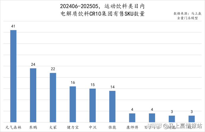基于馬上贏品牌CT中的數(shù)據(jù)可以看到,在202406-202505近一年的時(shí)間中,電解質(zhì)飲料類型產(chǎn)品的有售SKU數(shù)量上,元?dú)馍忠?1款有售SKU數(shù)量位居第一,明顯領(lǐng)先于后面的東鵬、大冢等集團(tuán)。第二梯隊(duì)則是布局較早的健力寶、中沃、依能等集團(tuán)。相比來說,康師傅、百事可樂、達(dá)能、統(tǒng)一等品牌的SKU布局?jǐn)?shù)量與儲備整體較少。在類目發(fā)展速度快、方向不好把握的前提下,豐富的產(chǎn)品儲備也能通過概率的方式大大提升命中率,并對市場做出一定的方向上的引導(dǎo)。