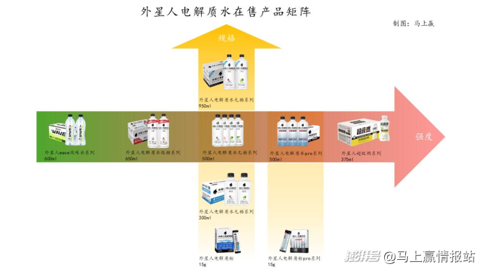 經(jīng)馬上贏研究整理,外星人的電解質(zhì)飲料產(chǎn)品矩陣,基本圍繞著“一橫一縱”進(jìn)行展開,更多的規(guī)格,更多的口味與對于專業(yè)補(bǔ)充需求的強(qiáng)度,使得整個(gè)矩陣可以適配更多的消費(fèi)場景,無論是日常尋求“水替”,還是中高強(qiáng)度專業(yè)運(yùn)動(dòng)后補(bǔ)充電解質(zhì)的需求,外星人電解質(zhì)水旗下都有對應(yīng)的產(chǎn)品能夠滿足消費(fèi)者。