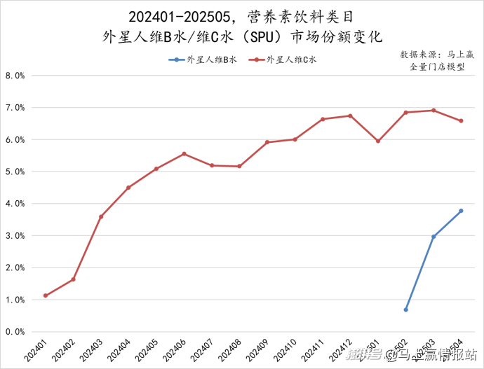 從數(shù)據(jù)中可以看到,2024年年初,外星人維C水率先投入市場并進(jìn)行大規(guī)模推廣,從2024年2月到2024年6月,短短四五個(gè)月的時(shí)間,維C水SPU(包含多規(guī)格、多口味)在營養(yǎng)素飲料類目中的市場份額快速拉升到超過5%,并在隨后的202406-202504時(shí)間段中,保持這正向增長的趨勢,該SPU截至2025年4月在營養(yǎng)素飲料類目中的市場份額已經(jīng)接近7%。