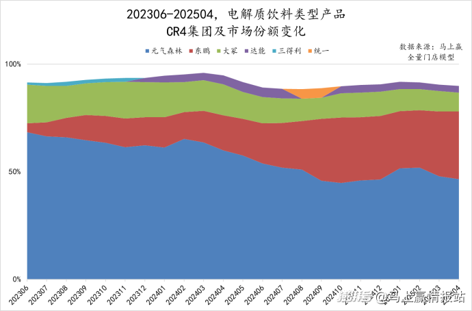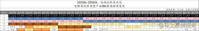 從CR6集團(tuán)的市場份額排名上看,排名前三的集團(tuán)在202306-202504期間只有元?dú)馍?、大冢與東鵬,唯一的變化在于2024年3月,東鵬超過大冢寶礦力水特晉升為排名第二。相比來說,第四-第六名的爭奪則較為激烈,2023-2024年度,4-6名的常客為三得利、健力寶與達(dá)能,至2024-2025年度,4-6名的??蛣t變成了達(dá)能、統(tǒng)一與康師傅。