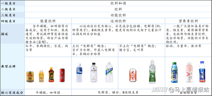 基于馬上贏品牌CT的分類,詳細(xì)來看,整個(gè)功能飲料類目分為三個(gè)子類,分別是能量飲料、運(yùn)動(dòng)飲料以及營養(yǎng)素飲料。以核心有效成分劃分,能量飲料的核心有效成分為?;撬帷⒖Х纫?,更傾向于短期的強(qiáng)功效,而營養(yǎng)素飲料的核心有效成分更多為各族維生素,偏向于長期的維生素補(bǔ)充及改善性的功效。