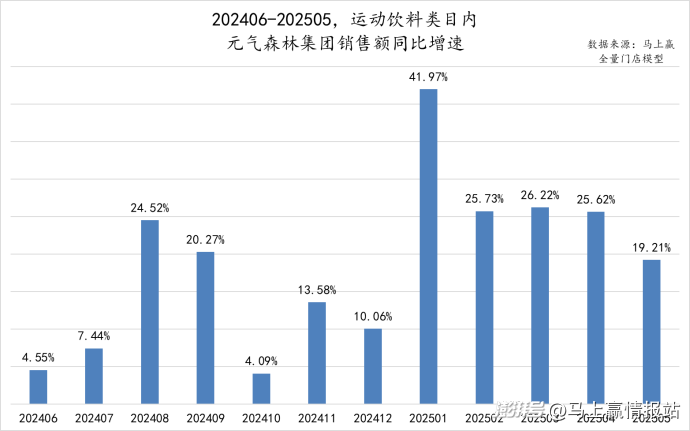 聚焦到以外星人電解質(zhì)水為核心的元?dú)馍肿陨碓谶\(yùn)動(dòng)飲料類目中的發(fā)展情況,可以看到,近一年的時(shí)間中,所有月份均保持正向的銷售額同比增速。進(jìn)入2025年以來,增速似乎整體上了一個(gè)臺階,除了1月因?yàn)榇汗?jié)錯(cuò)位導(dǎo)致的超過40%的增長外,從二月到五月,元?dú)馍衷陬惸績?nèi)的銷售額同比增速始終保持在20%左右,增速頗高。