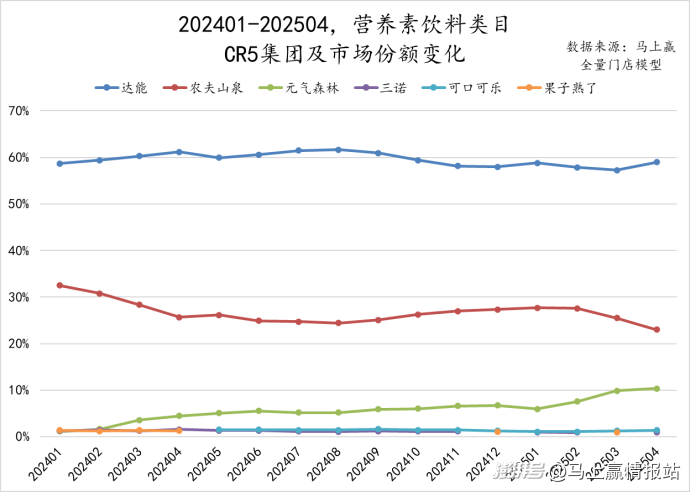 基于馬上贏品牌CT中的數(shù)據(jù)看,從202401-202504,營養(yǎng)素飲料類目CR5集團(tuán)的市場份額變化,排名第一的達(dá)能市場份額較為穩(wěn)固,排名第二的農(nóng)夫山泉或是受到元?dú)馍值臄D壓,市場份額有一定的下滑趨勢。元?dú)馍謶{借外星人維B水、維C水系列產(chǎn)品,雖然已經(jīng)成為了營養(yǎng)素類目市場份額第三的集團(tuán),市場份額也在持續(xù)增長,但與前兩名之間還依然有著較為顯著的差距。