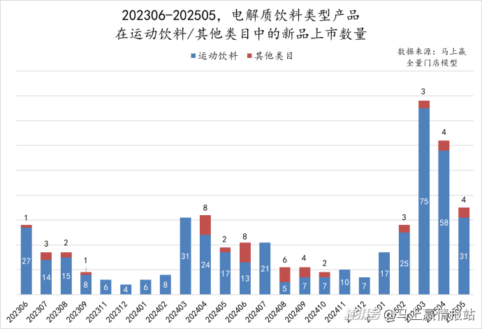 從202306到202505近兩年內(nèi),電解質(zhì)飲料類型產(chǎn)品的SKU上新情況看,電解質(zhì)飲料的競爭正在2025年進(jìn)一步加劇升級。從近兩年運(yùn)動(dòng)飲料類目內(nèi)電解質(zhì)飲料的SKU上新數(shù)量對比看,2025年2-5月的上新數(shù)量比2024年同期的上新SKU數(shù)量多出一倍有余,足見競爭激烈情況。