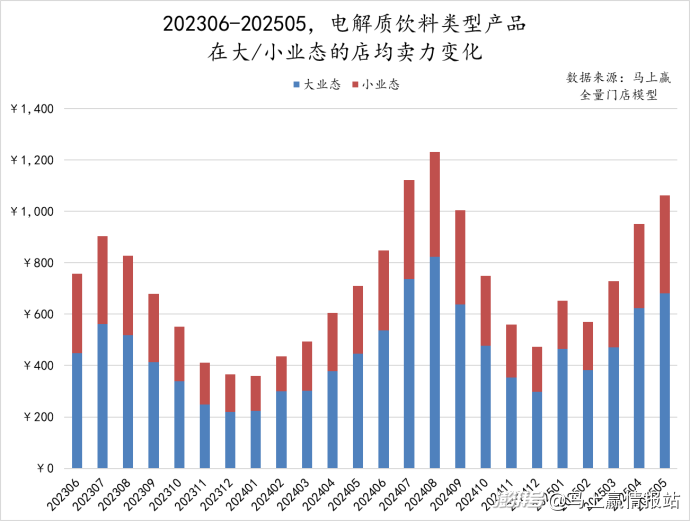 在店均賣力上,可以看到,自2023年6月起至2025年5月,電解質(zhì)飲料類型產(chǎn)品在各業(yè)態(tài)中的店均賣力呈現(xiàn)出同比上升的趨勢,大/小業(yè)態(tài)在期內(nèi)均保持同比增長。店均賣力的持續(xù)提升,推動(dòng)更多的渠道在更好的位置,用更多的資源來進(jìn)行電解質(zhì)飲料的銷售,讓消費(fèi)者有更多優(yōu)先選擇電解質(zhì)飲料的機(jī)會。消費(fèi)者選擇的增加,會進(jìn)一步提升店均賣力,讓渠道有著更多的銷售積極性,從而形成正向的循環(huán)。