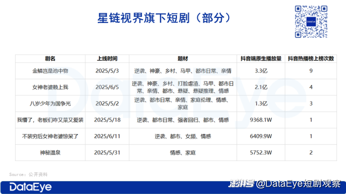 從端原生播放量來看,今年 5 月起,星鏈視界旗下短劇開始發(fā)力,《金鱗豈是池中物》《女神老婆賴上我》《八歲少年為國爭光》等 6 部短劇在抖音端原生播放量突破 5000 萬。60天內(nèi)劇集在端原生的總播放量超13.67億。其中,《金鱗豈是池中物》抖音端原生播放量達(dá)3.3億,9次躋身DataEye抖音熱播榜,堪稱近期的行業(yè)爆款內(nèi)容。該公司在短劇內(nèi)容的投入低調(diào)而堅(jiān)決,據(jù)了解目前正在制作的短劇內(nèi)容有20余部,后續(xù)的短劇作品非常值得期待。