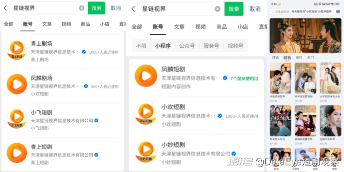 在渠道分發(fā)層面,DataEye短劇觀察發(fā)現(xiàn),星鏈視界已在微信、抖音、快手、紅果、拼多多等主流流量平臺上設(shè)立了劇場賬號及短劇小程序。