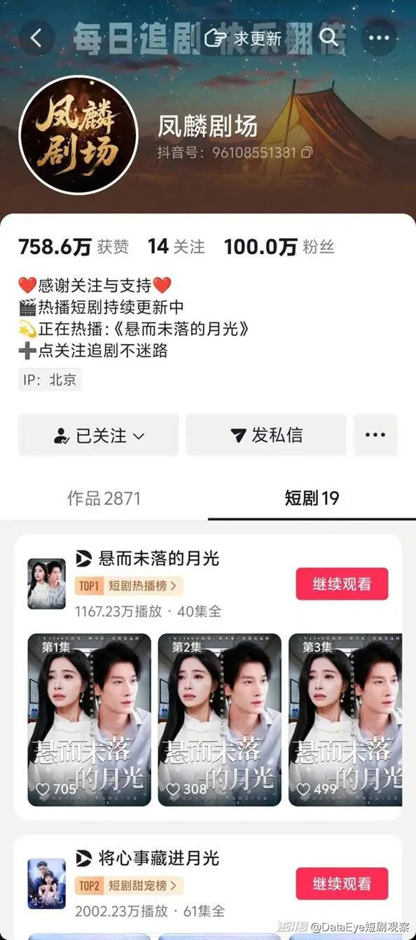 比如,微信端布局鳳麟劇場、星戀劇場、小歡短劇、小妙短劇、青上劇場等多個短劇小程序;抖音端則以劇場號 “鳳麟劇場” 為核心陣地,該賬號目前粉絲量達(dá) 100 萬,點(diǎn)贊量突破 757萬,已上線 19 部短劇作品。令人驚訝的是,該賬號今年4月末粉絲量還不足8萬,在不到2個月的時間內(nèi),粉絲量翻了十余倍。