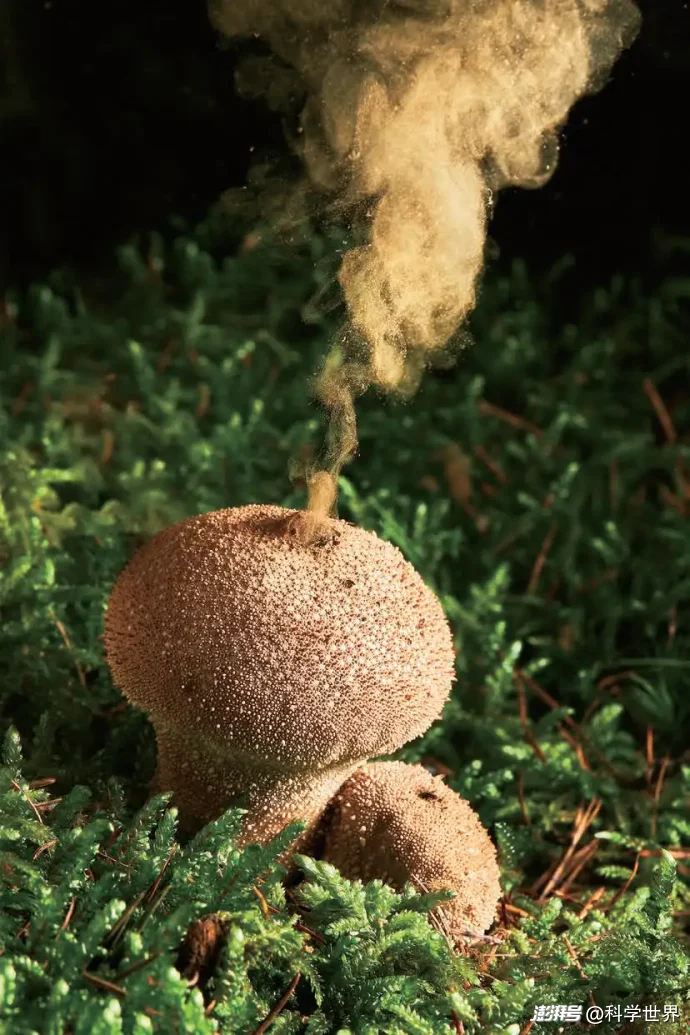 網(wǎng)紋馬勃成熟時,頭部表皮頂端會開裂形成一個小洞,從中釋放孢子。當孢子飛出時,如同噴射的棕色粉塵,正是人們熟知的馬勃屬的特征。
