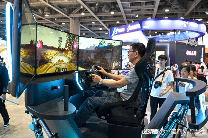 圖為在廣州舉辦的游戲展上,游戲愛好者正在體驗(yàn)賽車模擬器。(圖片由CNSPHOTO提供)