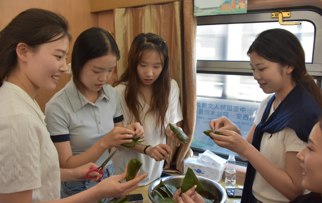 2025年5月30日,在中國(guó)-中亞國(guó)際人文旅游專列(西安—阿拉木圖段)上,乘客在包粽子。 新華社記者 楊一苗 攝