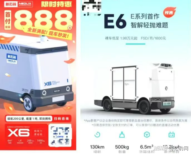 億豹網(wǎng)發(fā)現(xiàn),新石器此次推出的X6車型首付方案,將入門門檻降至888元,低于九識(shí)智能E6系列1.98萬元的起售價(jià),但九識(shí)給出了新用戶首臺(tái)車9900元的半價(jià)權(quán)益,兩家FSD服務(wù)費(fèi)價(jià)格均在每月1800元左右。面對(duì)如此低的門檻,尤其在快遞、社區(qū)配送等高頻次、低毛利場(chǎng)景中,能快速提升用戶采購(gòu)意愿。