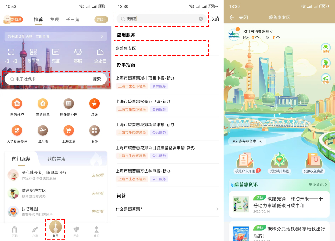 登錄“隨申辦市民云”APP→首頁搜索“碳普惠”→點擊“碳普惠專區(qū)”;