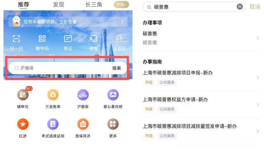 1、打開“隨申辦市民云”APP,在首頁搜索“碳普惠”關(guān)鍵詞,或者點(diǎn)擊下方的“隨申辦”圖片,即可進(jìn)入碳普惠專區(qū)頁面。