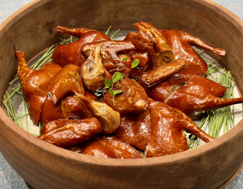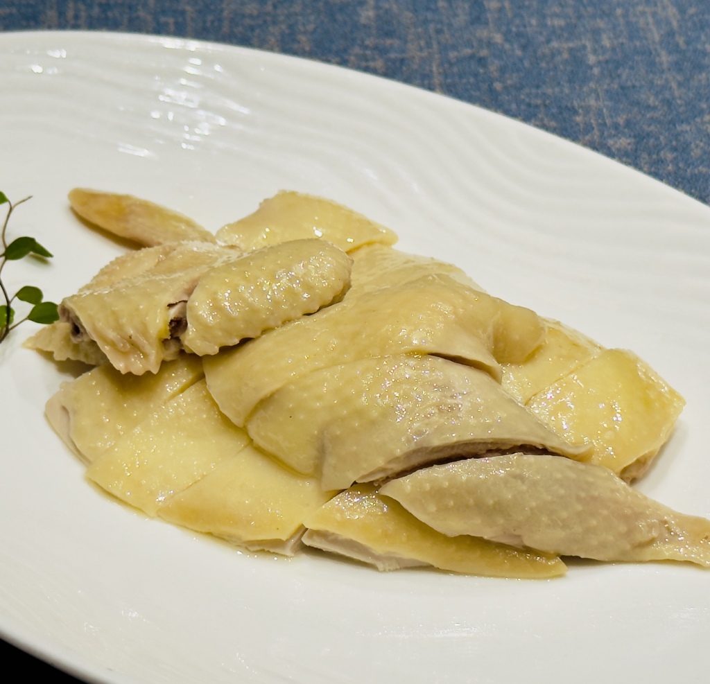 老母雞汁百葉包、熏鯧魚、糟味四寶拼盆、甬式醬烤菜心,妥妥的家常風(fēng)味,弄堂人家從小吃慣的老阿奶味道。深井燒鵝在四十年前登陸上海灘,是粵菜大舉進(jìn)入魔都的先頭部隊(duì),曾經(jīng)風(fēng)靡一時(shí),成為上海人的味覺啟蒙。如今能保持燒鵝皮脆肉松,內(nèi)含汁液的效果,所剩無幾啦。白切杏花雞與本幫白斬雞畫風(fēng)相似,但勝在食材本味。杏花雞是一種很有年代感的雞種,原產(chǎn)于廣東封開縣杏花公社,改革開放后在廣東的懷集、德慶、郁南、新興、肇慶、佛山、廣州等地都有飼養(yǎng),杏花雞屬于小型肉用優(yōu)質(zhì)雞種,是中國活雞出口經(jīng)濟(jì)價(jià)值較高的名產(chǎn)雞之一。它胸肌豐滿,肌肉纖細(xì),皮薄而皮下脂肪分布均勻,帶有迷人的光澤,特別適宜烹制白切雞。以前吃貨朋友以清遠(yuǎn)雞為至美享受,這幾年又流行吃葵園雞,現(xiàn)在終于輪到杏花雞走秀了。白切,蘸姜茸吃,在鮮香嫩滑方面可與小紹興白斬雞比美。