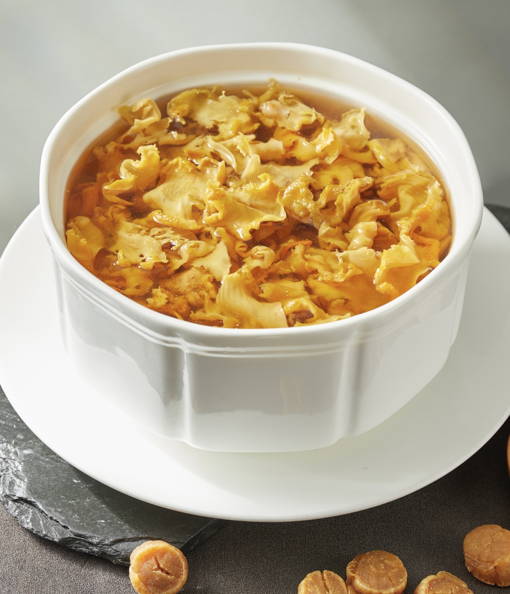他家的干貝響螺湯我在十年前就領(lǐng)教過,螺片下得非??犊?,鋪天蓋地似的,真搞不懂老板想不想賺錢,所以印象很深刻。這個(gè)響螺也來自日本北海道,采購價(jià)比英國紅螺要貴。解凍后洗凈,也要在烤箱里烤十五分鐘,收去一部分水分,使其出香。底湯也相當(dāng)講究,用老母雞、赤肉、棒骨、瑤柱、鳳爪和火腿等吊成底湯,最后將切薄片的螺肉投入鍋內(nèi),煲五六個(gè)小時(shí),螺肉微微皺起荷葉邊,縮小三分之一不止,但依然不柴不僵,略帶嚼勁,越嚼越香。