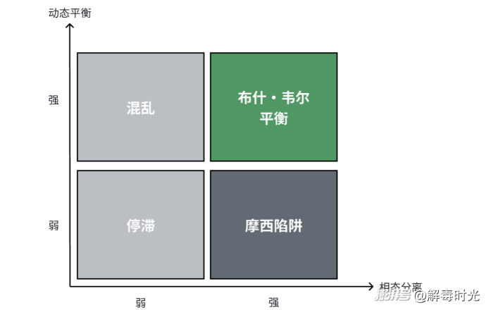 而根據(jù)相態(tài)分離和動態(tài)平衡的程度,當達到適應(yīng)的強度的時候,就可以形成“布什·韋爾平衡”,如果相態(tài)分離過強,而動態(tài)平衡較弱,就會陷入到摩西陷阱。另外在弱相態(tài)分離的情況下,動態(tài)平衡過強則會陷入混亂,過弱則會導(dǎo)致停滯。