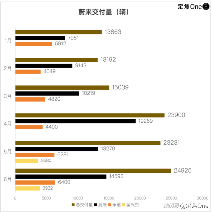 蔚來(lái)系(蔚來(lái)+樂(lè)道+螢火蟲)6月合力交付24925臺(tái),同比增長(zhǎng)17.5%,排名第六。