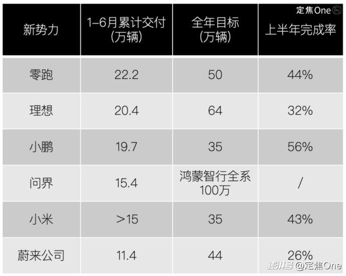 蔚來(lái)三大品牌上半年合計(jì)交付11.4萬(wàn)輛,目標(biāo)完成率26%,在新勢(shì)力中暫時(shí)落后。