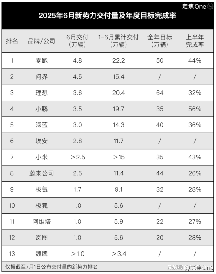 零跑以22.2萬(wàn)輛的累計(jì)交付,鎖定半年冠軍,年度目標(biāo)完成率44%。