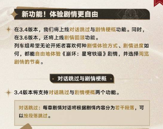 據(jù)介紹,對話跳過功能支持按段落跳過開拓任務、開拓續(xù)聞等任務對話;跳過時系統(tǒng)將提示當前段落的主要角色與劇情梗概描述。