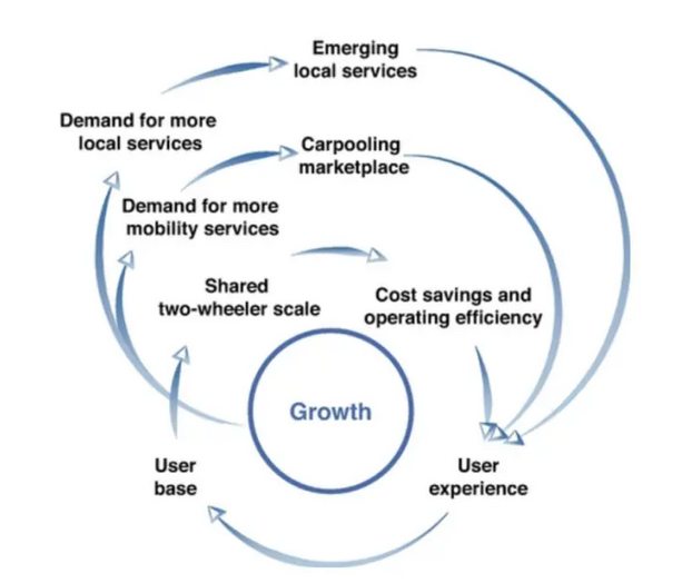 但哈啰的飛輪,卻走了岔路。與美團(tuán)一頭連接消費(fèi)者、一頭連接海量商家的模式不同,哈啰共享單車飛輪的另一頭,連接的卻是哈啰自己。