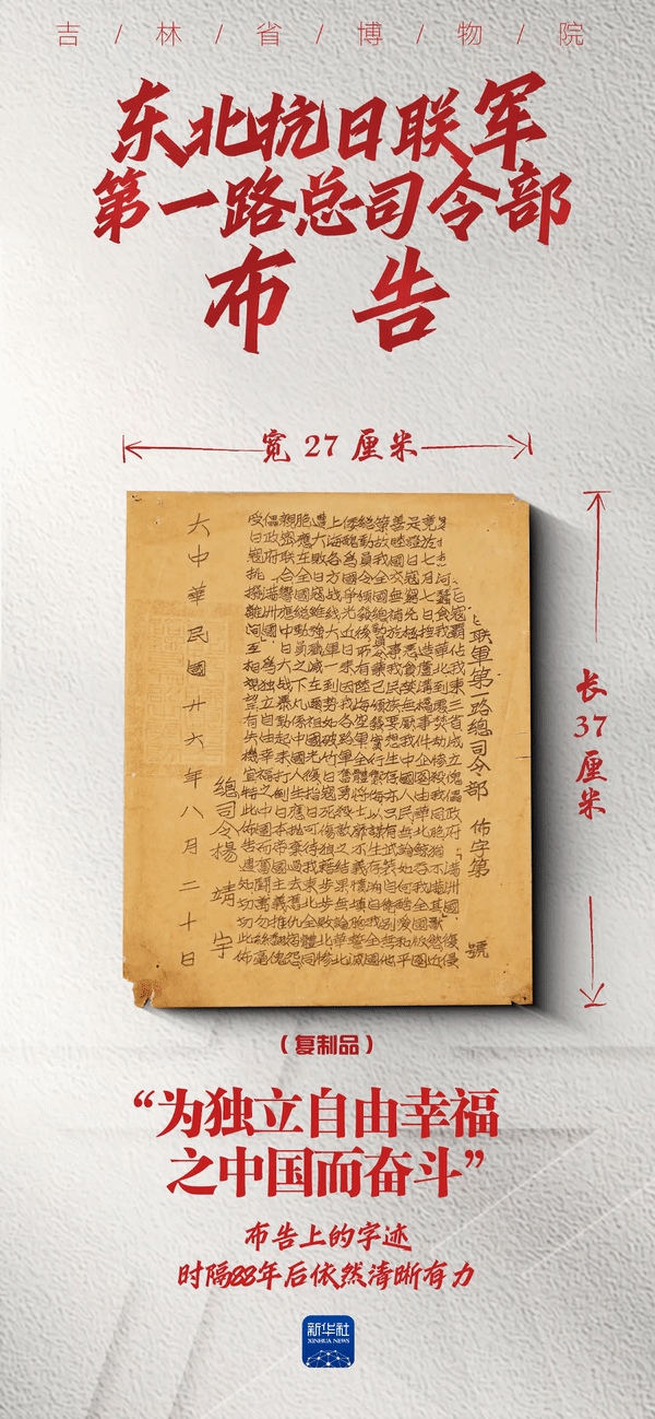 彼時(shí),東北抗戰(zhàn)如火如荼,“七七事變”爆發(fā)后,楊靖宇以東北抗日聯(lián)軍第一路軍總司令的名義,發(fā)出這份布告,號(hào)召東北各族人民團(tuán)結(jié)一致、驅(qū)除日寇。為配合關(guān)內(nèi)抗戰(zhàn),在他的帶領(lǐng)下,抗聯(lián)將士們?cè)谀蠞M地區(qū)積極開展抗日游擊戰(zhàn),有力地牽制了日軍兵力。兩年以后,抗戰(zhàn)的吶喊久久回響,而將軍,卻犧牲在了那個(gè)嚴(yán)冬。