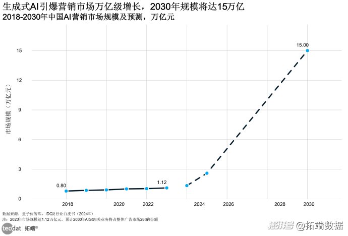 AI營銷市場(chǎng)自2018年以來,就像一顆冉冉升起的新星,展現(xiàn)出驚人的增長(zhǎng)潛力。2018年其市場(chǎng)規(guī)模為7990億元,隨后逐年穩(wěn)步增長(zhǎng),到2023年達(dá)到11162億元。這期間,AI技術(shù)在營銷領(lǐng)域的應(yīng)用逐漸被企業(yè)認(rèn)可,從最初的試探性使用到逐步規(guī)模化應(yīng)用,推動(dòng)著市場(chǎng)不斷向前。而未來的增長(zhǎng)更是讓人驚嘆,預(yù)計(jì)2024年市場(chǎng)規(guī)模將達(dá)到13465億元,2025年更是將飆升至26000億元,到2030年將突破150000億元。這樣的增長(zhǎng)速度,背后是生成式AI技術(shù)的成熟與普及。生成式AI能夠快速生成大量高質(zhì)量的營銷內(nèi)容,從圖文到視頻,滿足了企業(yè)多樣化的營銷需求,大大提高了營銷效率,也降低了營銷成本,從而吸引了更多企業(yè)投身于AI營銷的浪潮中。