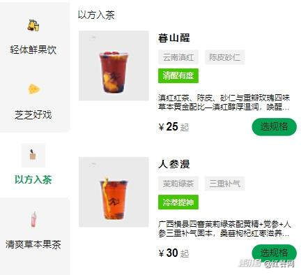 值得一提的是,見康星茶飲的“以方入茶”系列產品使用了大量藥食同源的原料,價格也更高,在25到30元之間——比如“人參漫”這款產品中,含有黃精、黨參、人參,同時搭配桑葚、枸杞、紅棗和黃菊等,一杯賣30元。其他系列的茶飲價格為15-20元。